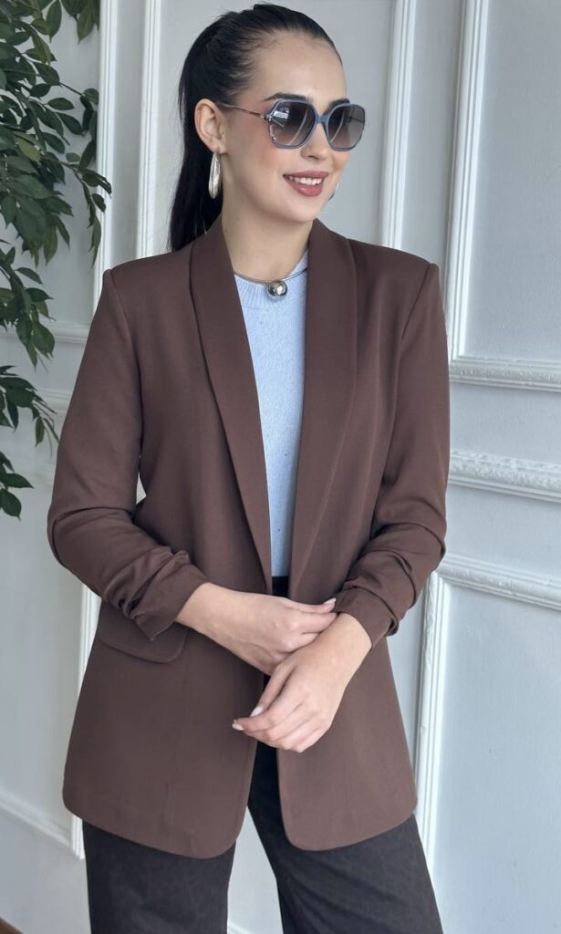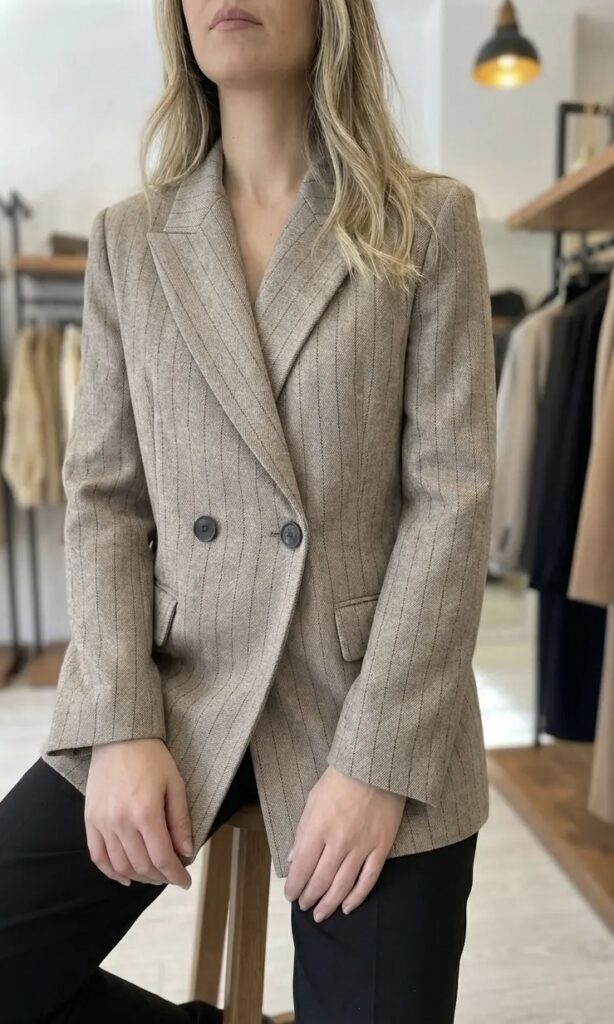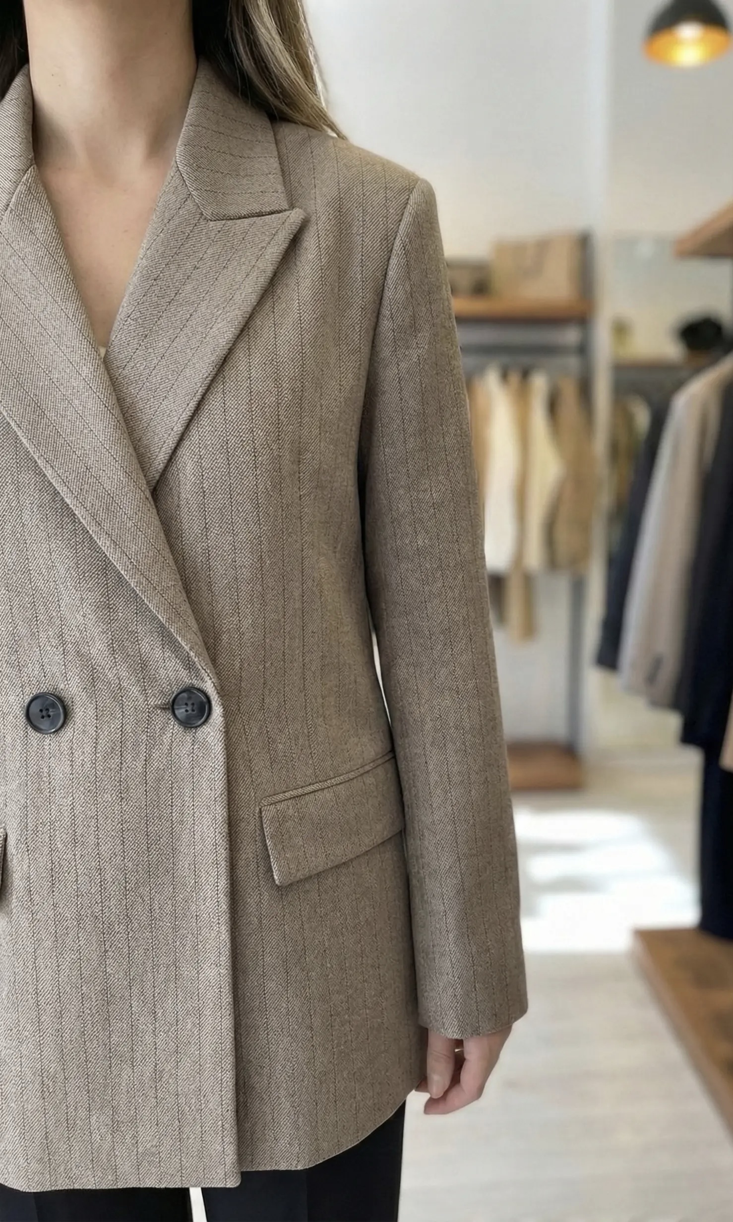 Le « Power Dressing » en version lumineuse. Ce blazer conserve l’autorité de la coupe croisée et des rayures tennis, mais l’adoucit avec une teinte beige taupe ultra-tendance. C’est l’alternative parfaite au noir ou au gris pour celles qui cherchent à marier professionnalisme et douceur. Structuré aux épaules, il sublime la carrure tout en restant féminin.