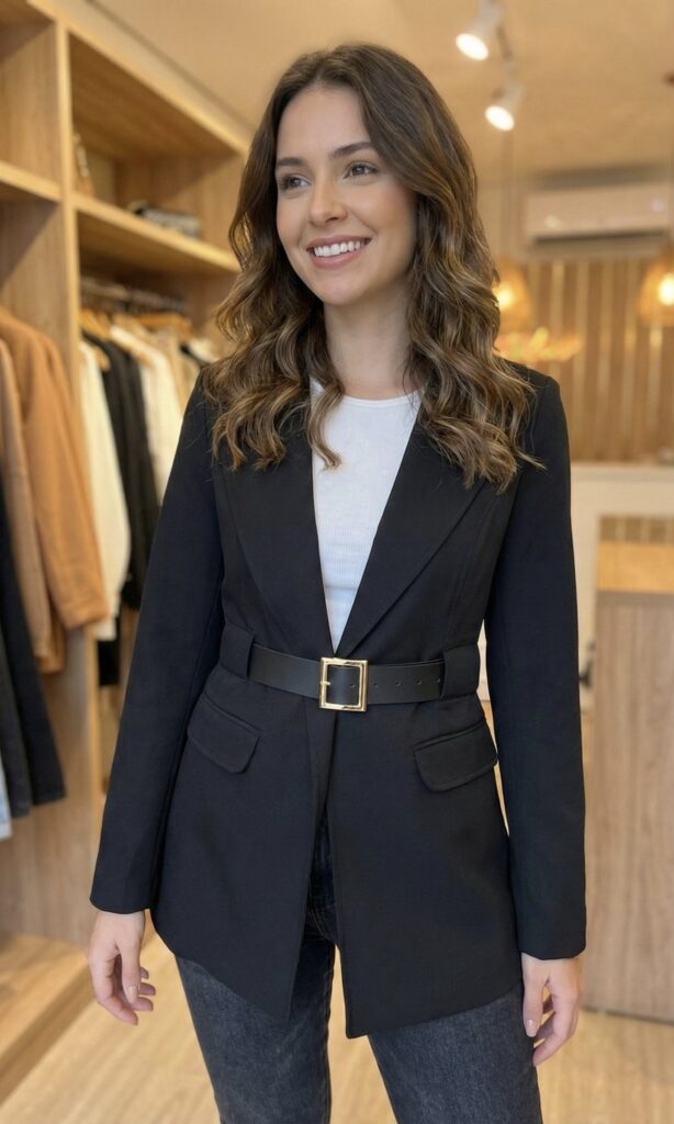 L’incarnation du « Power Dressing ». Cette veste de tailleur bleu nuit impose son style avec une coupe parfaitement cintrée qui sculpte la taille. Son double boutonnage et ses revers pointus lui donnent une allure sophistiquée et charismatique. C’est la pièce idéale pour transformer une tenue simple en un look de « Boss Lady ». Sublime portée avec un pantalon blanc pour un contraste lumineux.