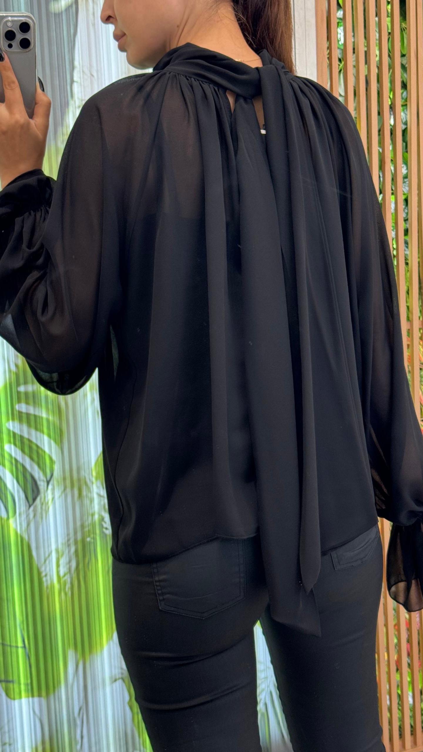 Blouse Noire Fluide en Voile à Col Montant