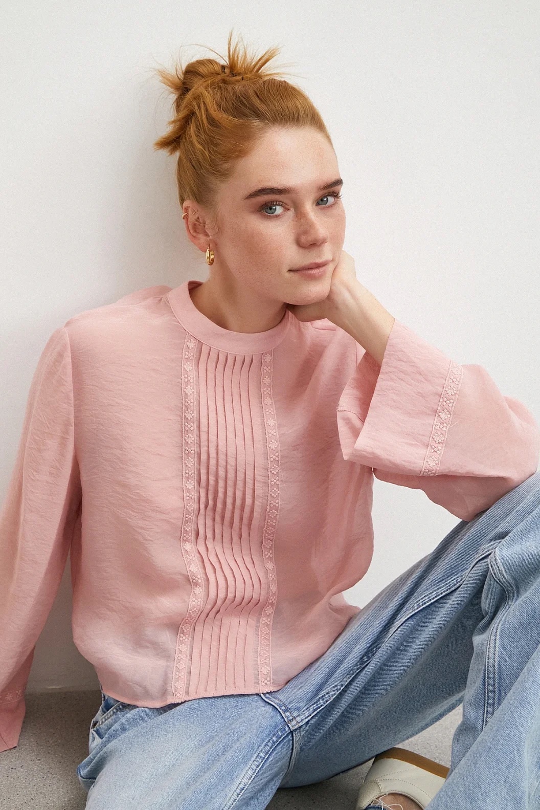 Laissez-vous charmer par notre nouvelle blouse rose poudré. Avec son col montant, ses plis délicats et ses détails en dentelle sur les manches, elle incarne la féminité et la douceur.