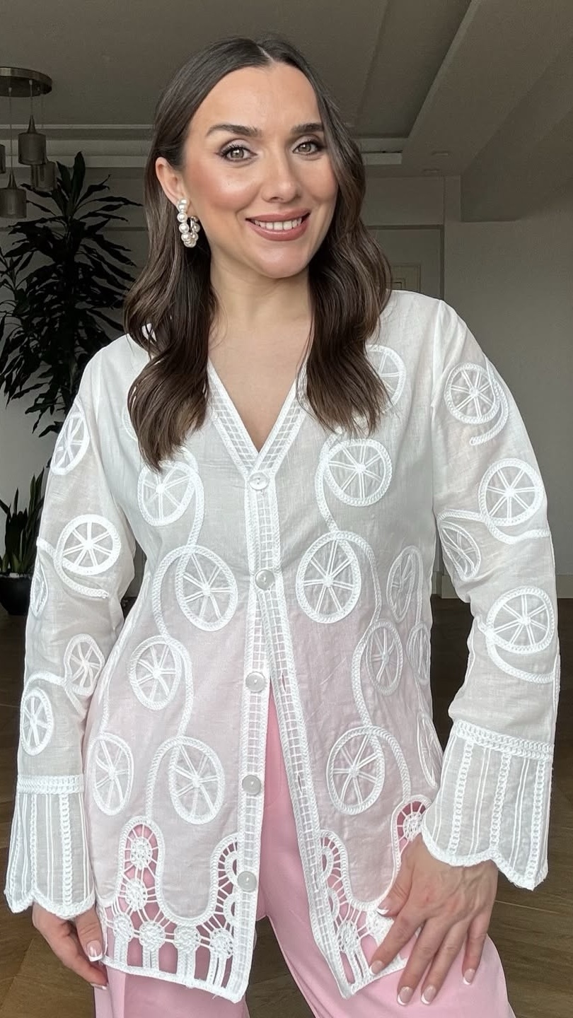 Succombez au charme sophistiqué de cette blouse vaporeuse, une pièce unique ornée d’un motif géométrique brodé délicat. La véritable star est la magnifique bordure en dentelle ajourée complexe qui sublime le bas de la blouse, ajoutant une touche de raffinement et de féminité. Son tissu léger et son encolure en V flattent la silhouette. Parfaite pour une allure chic au bureau avec un pantalon structuré ou pour une sortie élégante avec une jupe en satin.