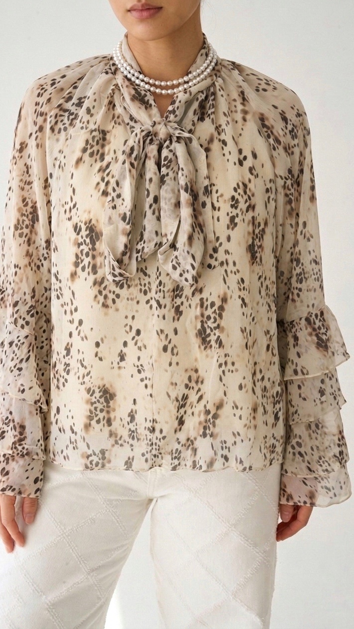 Succombez au charme sophistiqué de cette blouse vaporeuse ornée d’un motif cachemire baroque détaillé. Le col lavallière à nouer apporte une touche de romantisme et d’élégance intemporelle, tandis que les manches longues terminées par des poignets volantés délicats ajoutent une note de fluidité. Confectionnée dans un tissu léger et légèrement transparent, elle offre un confort absolu et un tombé impeccable. Idéale pour le bureau avec un pantalon noir structuré ou pour une sortie élégante avec une jupe en satin.