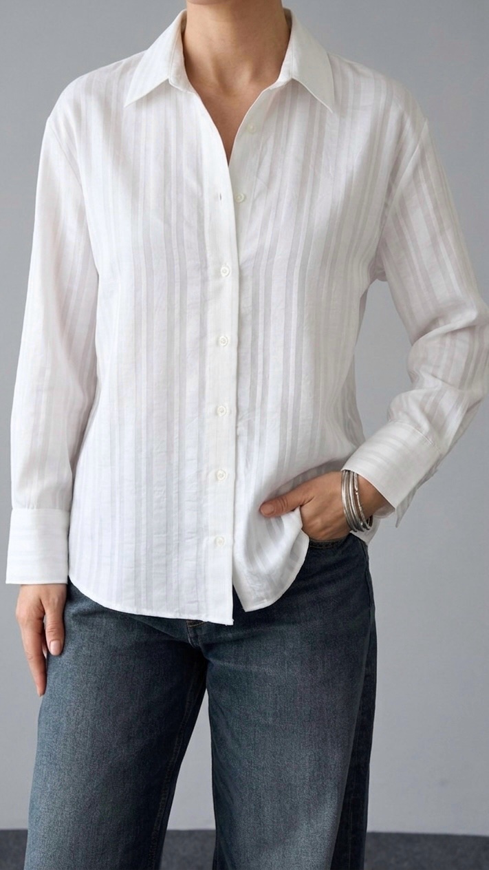 Indémodable et lumineuse, cette chemise blanche est la pièce maîtresse d’un vestiaire réussi. Elle se démarque par son tissage unique à rayures verticales en relief, apportant une texture riche et une touche d’originalité à un grand classique. Sa coupe fluide et son col structuré offrent un équilibre parfait entre confort et élégance. Portez-la ouverte sur un caraco ou boutonnée pour une allure plus formelle : elle s’adapte à toutes vos envies.