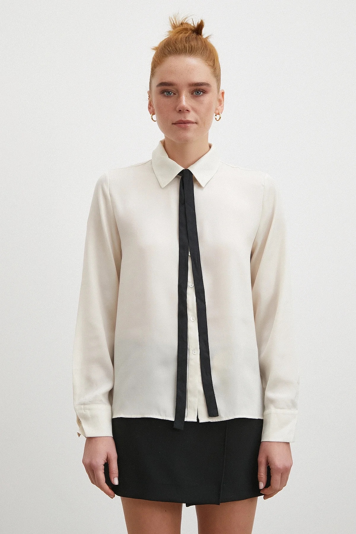 Chemise Fluide Écru – Col Ruban Noir (Style Preppy)