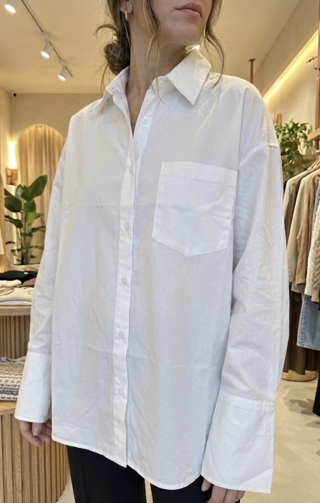 Le basique indémodable. Cette chemise en popeline de coton craquante offre un volume ample et moderne. Avec sa grande poche poitrine et ses manches longues aux poignets larges, elle se porte aussi bien en mode « working girl » rentrée dans un pantalon, qu’en sur-chemise décontractée le week-end.