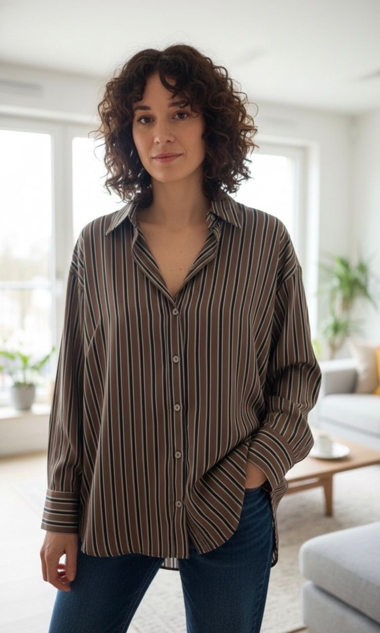 L’allure « Office Chic ». Cette chemise se distingue par son fond bordeaux profond rythmé par des rayures verticales graphiques (blanches et noires). Sa coupe légèrement ample offre un confort parfait tout en gardant une allure structurée. Idéale rentrée dans un jean clair pour un contraste lumineux, ou sous un blazer pour une touche de couleur au bureau.