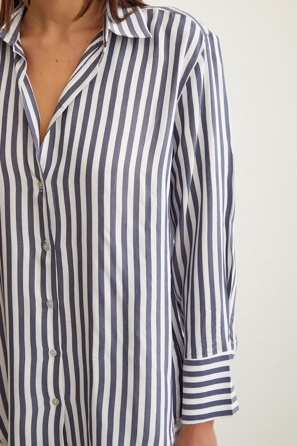 Le cool absolu. Cette chemise rayée bleue et blanche revisite les classiques avec une coupe oversize ultra-tendance. Le détail qui tue ? Les manches à revers qui créent un contraste graphique moderne. Portez-la ouverte sur un t-shirt blanc pour un look décontracté, ou rentrée dans un jean pour une allure « boyfriend » chic et sans effort.