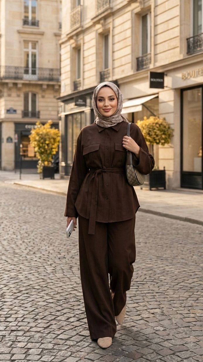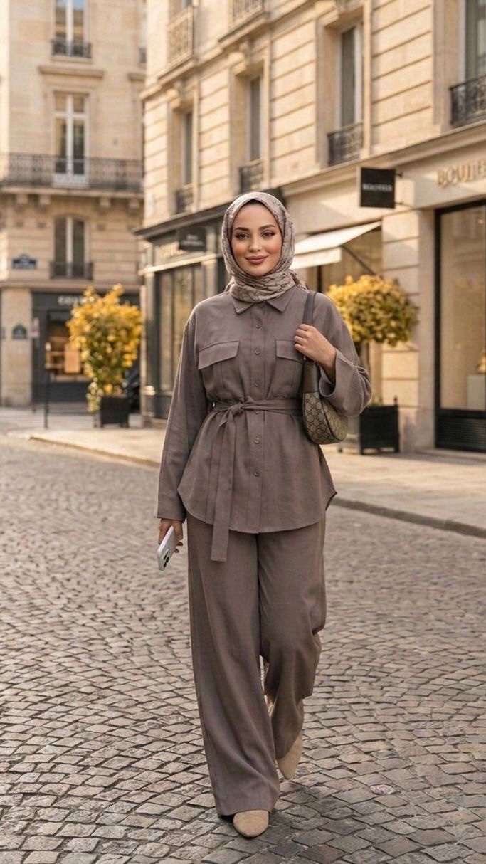 Ensemble 2 Pièces Chemise Ceinturée et Pantalon Large Taupe
