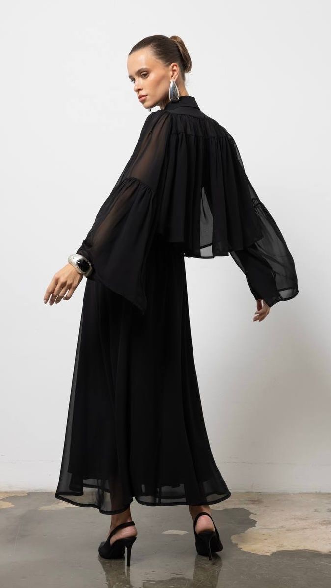 Laissez-vous séduire par la fluidité aérienne de l’ensemble « Aura ». Composé d’une jupe longue vaporeuse et d’un chemisier aux détails architecturaux, cet ensemble redéfinit l’élégance contemporaine. Conçu dans une mousseline légère et translucide, il joue avec les superpositions pour un effet de mouvement spectaculaire.