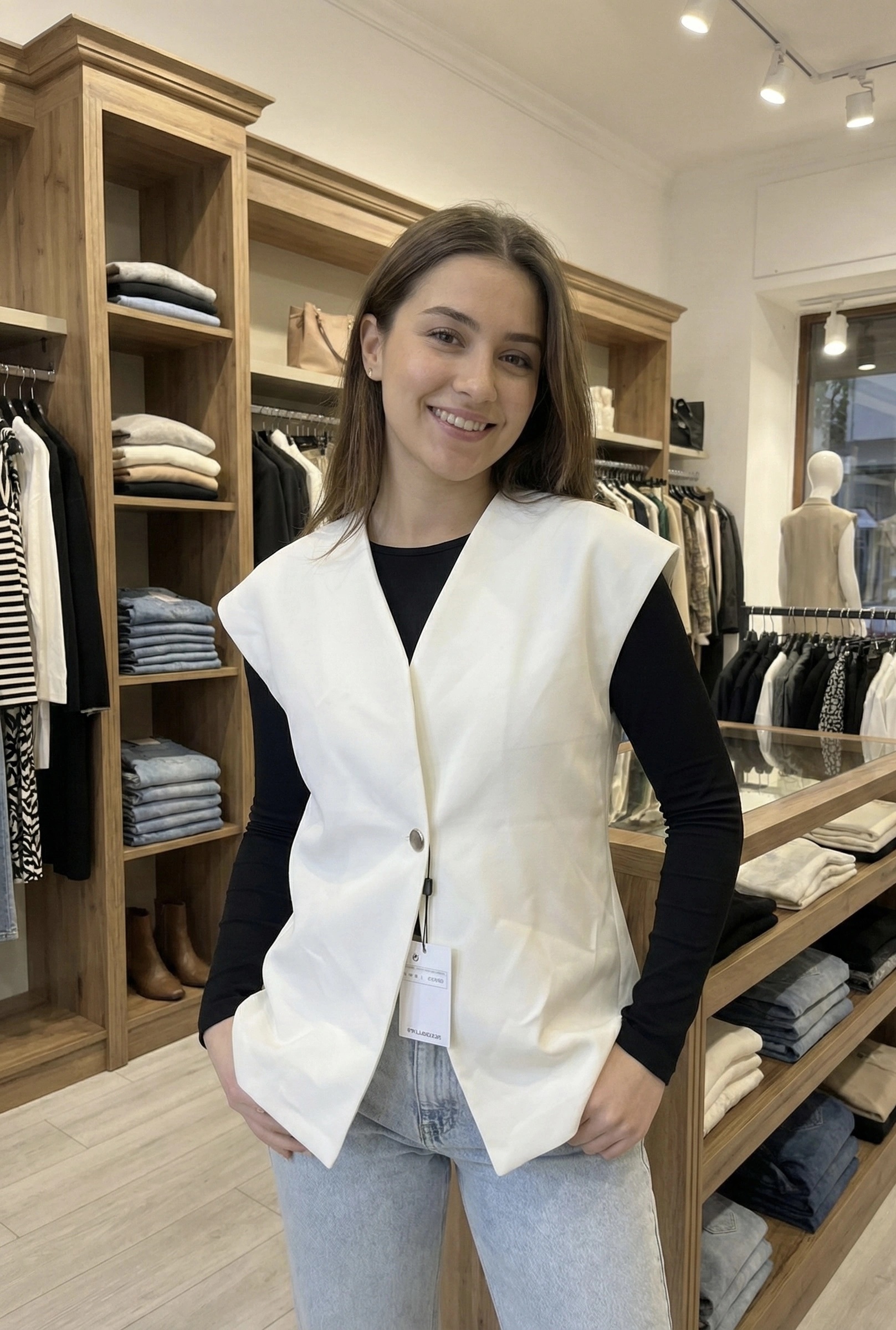 Illuminez votre look avec la version blanche de notre gilet tailleur incontournable. Avec sa coupe structurée et son col V élégant, il apporte une touche de lumière immédiate à votre tenue.