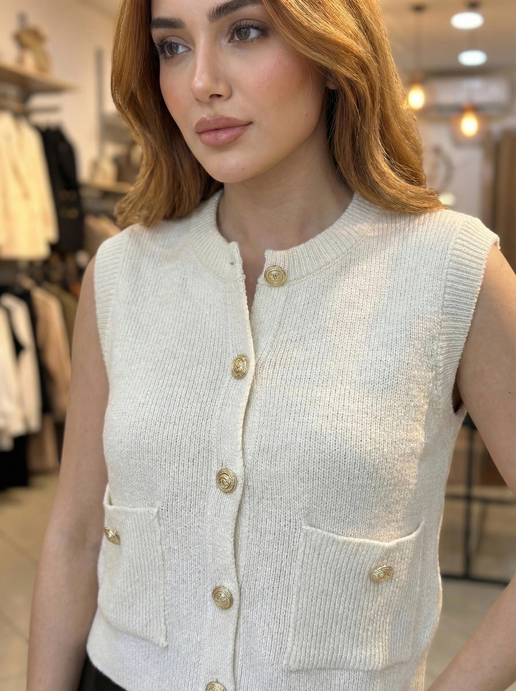 L’élégance rétro s’invite dans votre dressing avec ce gilet sans manches en maille reliefée. Sa couleur bordeaux profonde est illuminée par des boutons dorés style « officier » qui lui donnent une allure très couture.