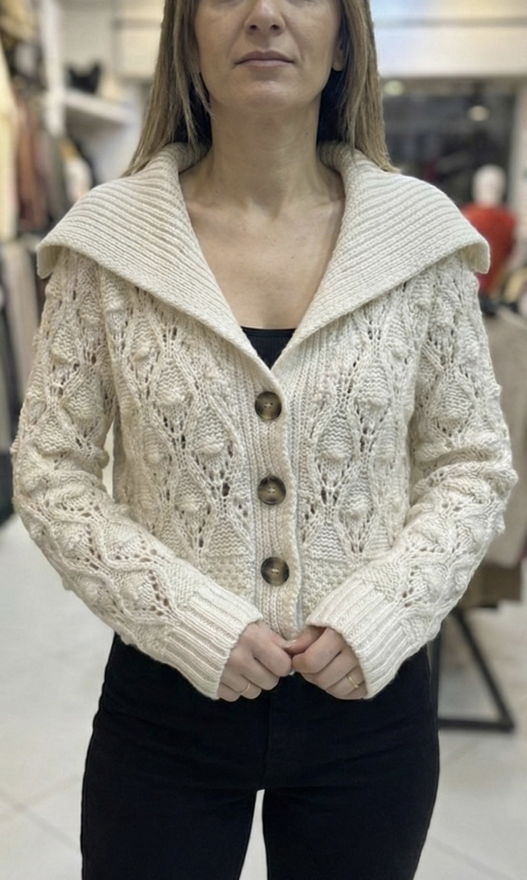 Enveloppez-vous de douceur avec ce cardigan en maille au charme intemporel. Sa teinte écru lumineuse et son tricot travaillé (mêlant jeux de points et reliefs) lui donnent un look authentique et précieux.