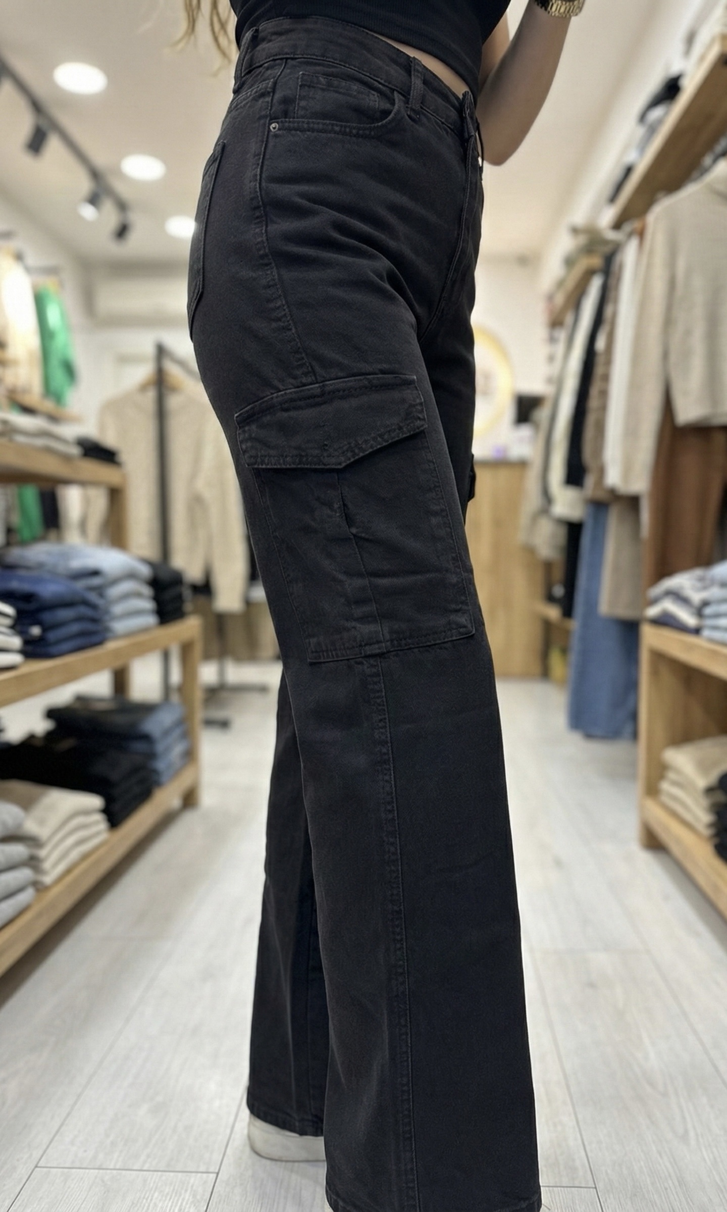 Jean Cargo Noir Taille Haute – Tendance Streetwear