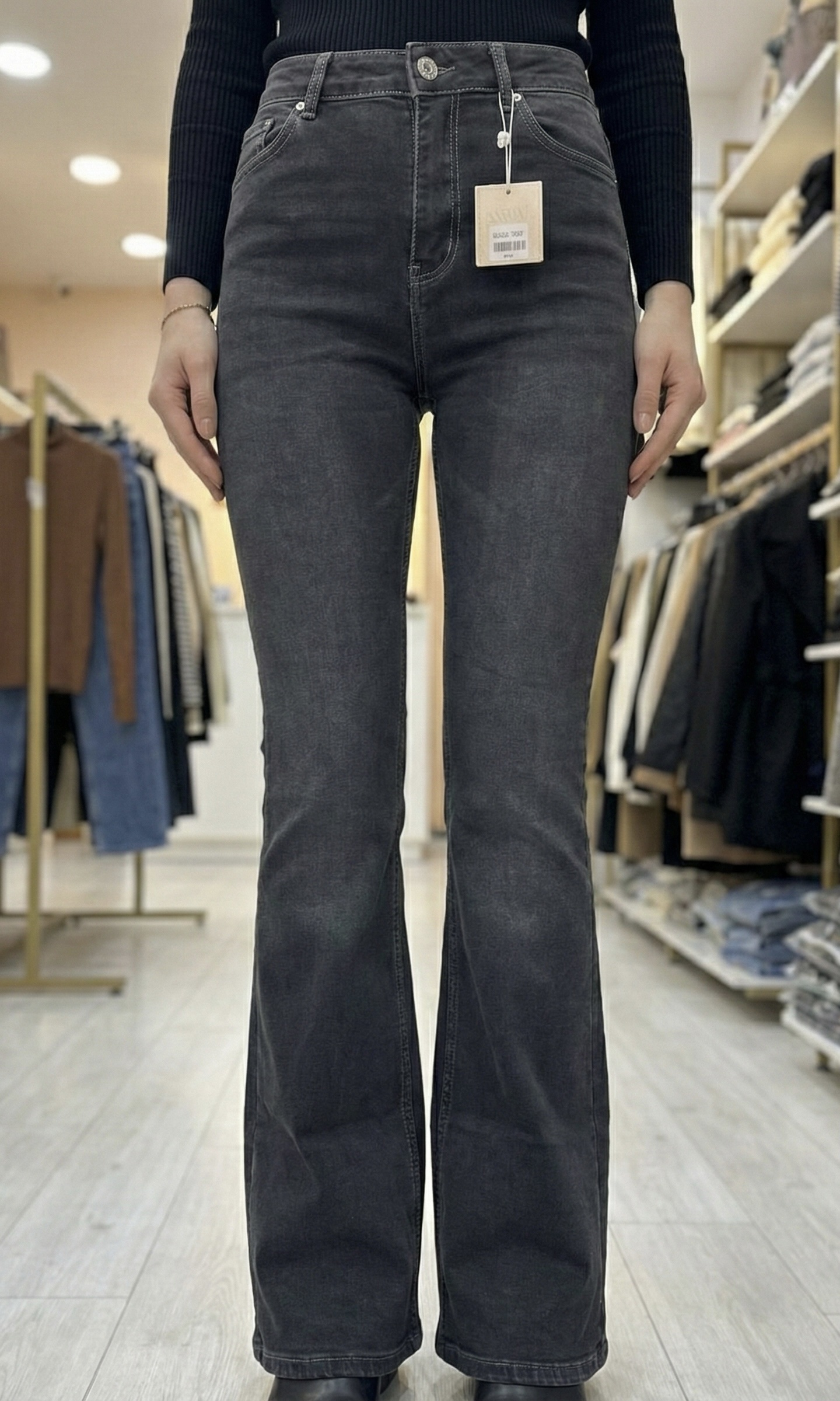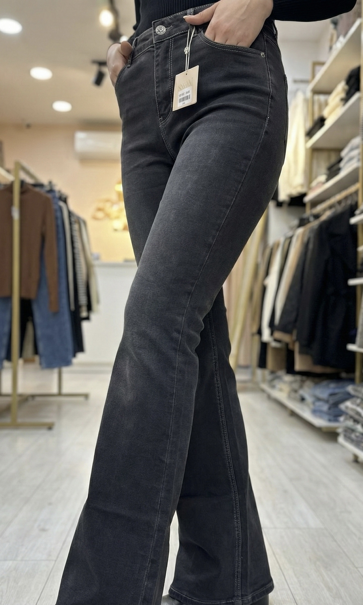 L’élégance rétro par excellence. Ce jean gris foncé délavé sublime la silhouette grâce à sa coupe Flare (évasée vers le bas) et sa taille haute. Il galbe les cuisses avant de s’élargir pour un effet « jambes infinies ». Une pièce forte et féminine, parfaite pour structurer votre look avec style.