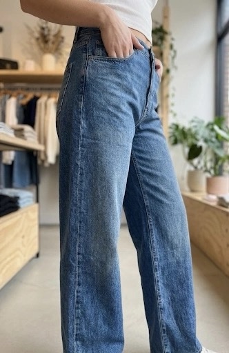 Ce jean à la taille haute et à la coupe droite structurée allonge la silhouette pour une allure impeccable. Sa toile bleu profond (indigo) et ses surpiqûres contrastantes en font une pièce polyvalente, idéale pour une tenue de bureau chic ou une sortie décontractée. Finition soignée et confort durable