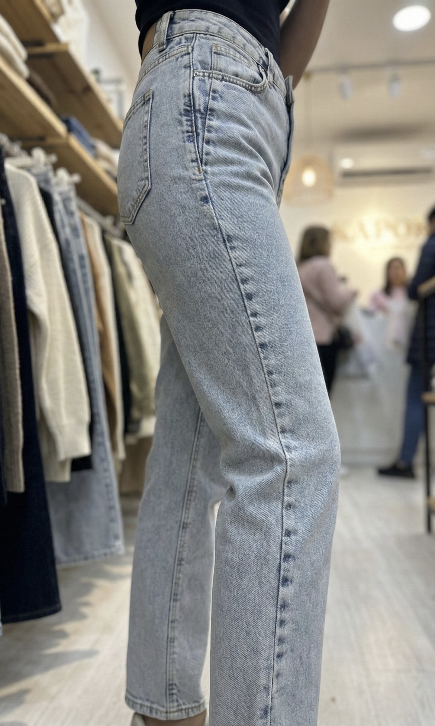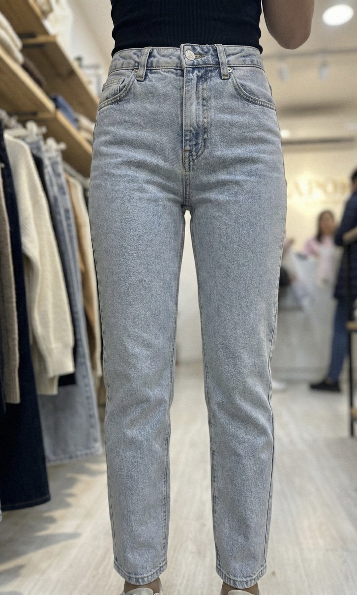 Le charme du vintage années 90. Ce jean coupe Mom en denim bleu très clair (bleu ice) apporte une touche de lumière et de fraîcheur à votre tenue. Sa taille haute marque la silhouette, tandis que sa coupe légèrement ample aux hanches et resserrée vers le bas assure un confort parfait et un style décontracté incontournable.