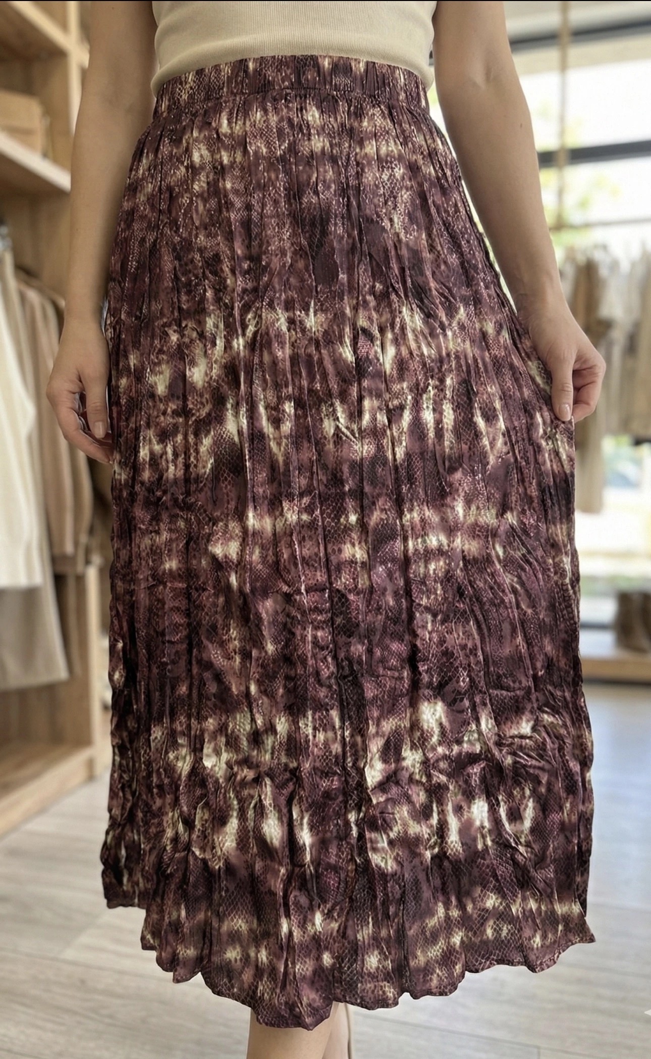 Sa matière texturée (effet froissé/plissé) et son motif abstrait rappelant le python dans des tons chauds (bordeaux, chocolat, crème) en font une pièce de caractère.