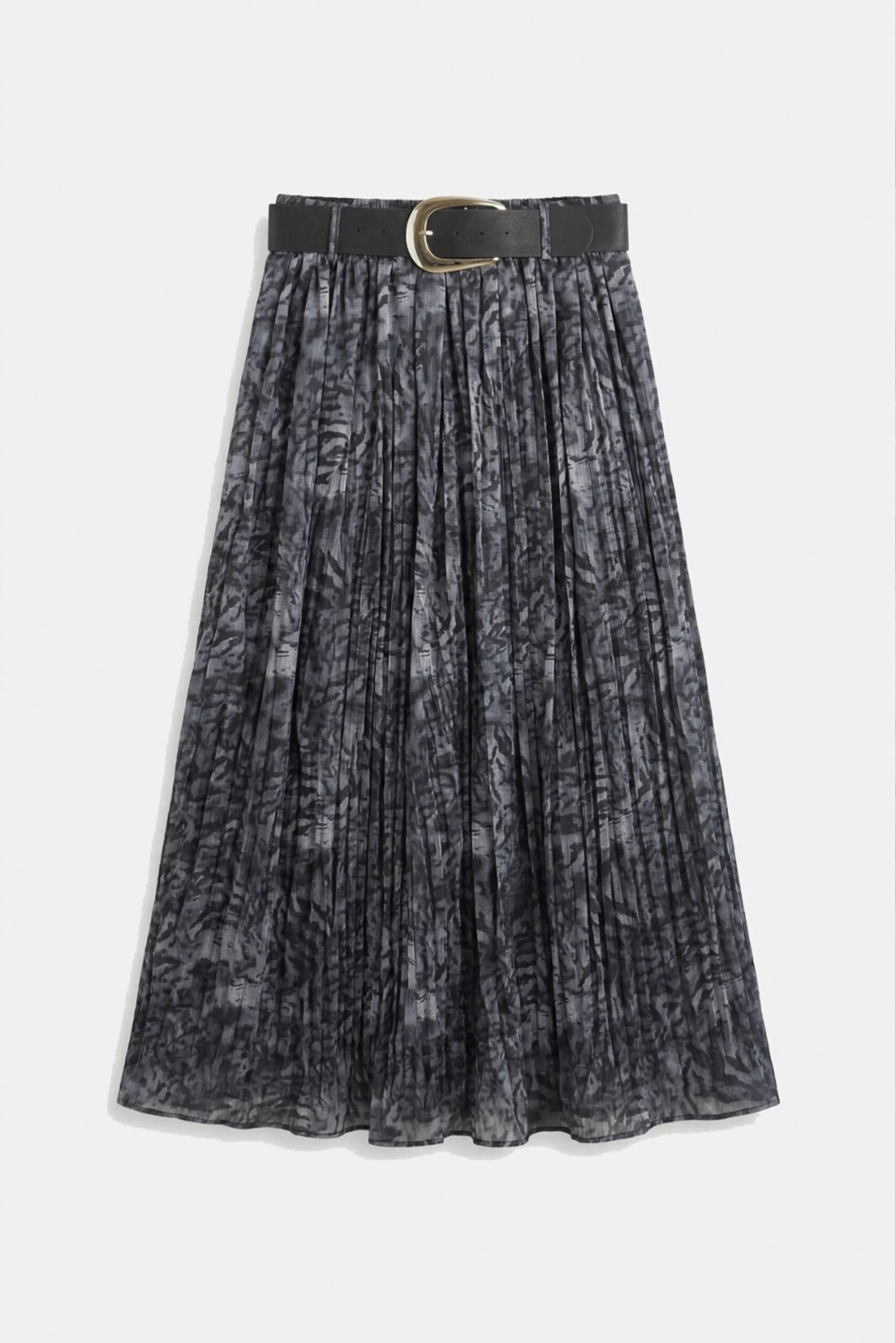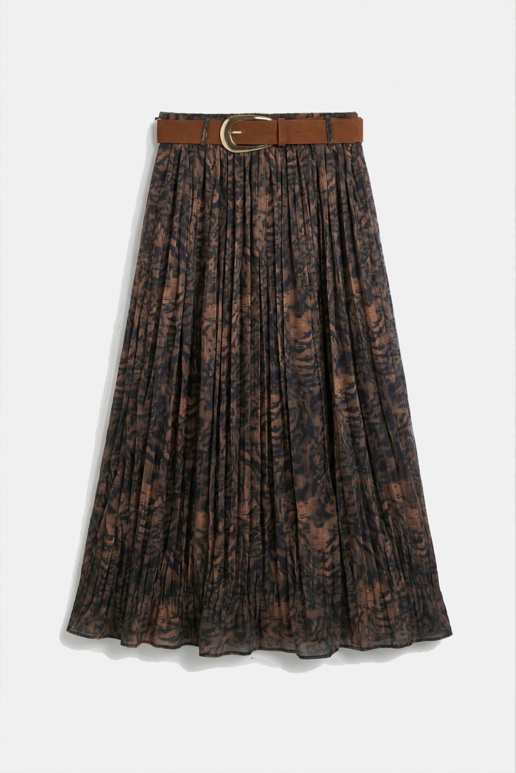 L’esprit bohème-chic réinventé. Cette jupe longue plissée se pare d’un imprimé abstrait aux nuances chaudes (marron, noir, caramel). Sa matière fluide danse à chaque mouvement pour une allure très féminine. Vendue avec sa ceinture coordonnée à boucle dorée qui marque la taille avec élégance. Parfaite avec des bottes en daim pour un look automnal réussi.