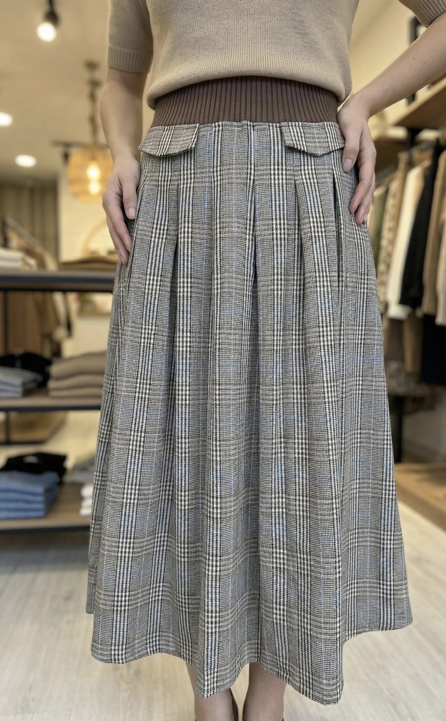 Cette jupe midi revisite le classique motif à carreaux (Prince de Galles avec une fine ligne bleue) en y ajoutant une touche moderne : une large ceinture en maille côtelée marron élastiquée. Fini les jupes qui serrent la taille ! Celle-ci s’adapte parfaitement à votre silhouette pour un confort absolu toute la journée.