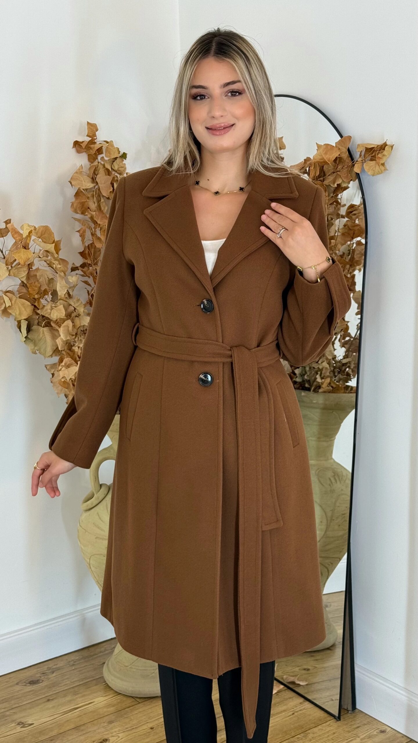 Ce manteau long apporte une touche chic et intemporelle à chaque tenue. Sa coupe structurée et sa ceinture à la taille subliment la silhouette avec simplicité.