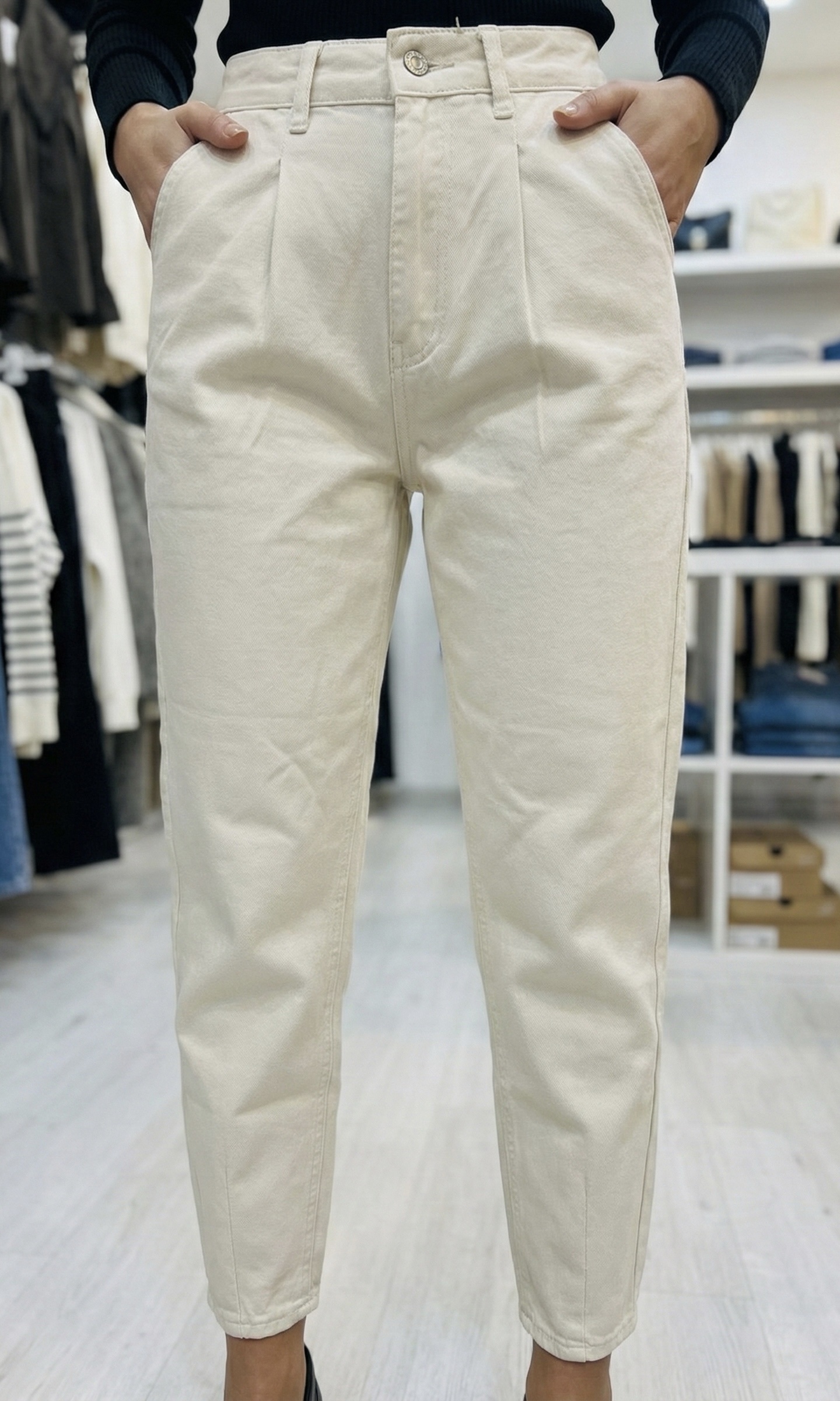 L’alliance parfaite entre le confort du denim et l’élégance du pantalon à pinces. Ce modèle écru se distingue par sa coupe « Slouchy » très tendance : une taille haute marquée, du volume aux hanches grâce aux pinces, et une jambe qui se resserre vers la cheville.