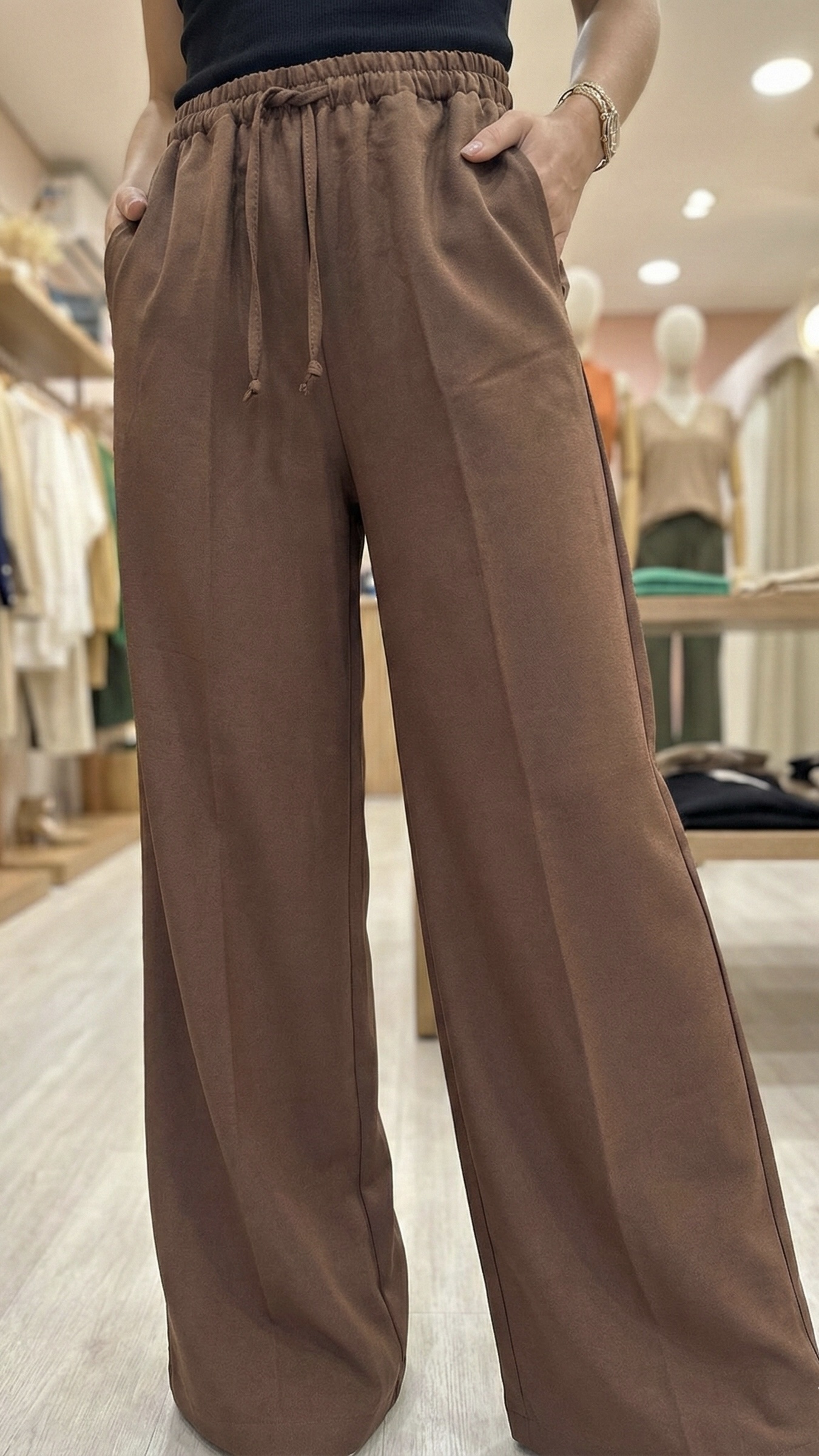 Adoptez une allure sophistiquée sans sacrifier votre confort avec notre nouveau pantalon large. Sa coupe fluide et ses plis marqués allongent la silhouette, tandis que sa taille haute élastiquée avec cordon de serrage assure un ajustement parfait tout au long de la journée. Un indispensable polyvalent, idéal pour le bureau ou une sortie chic.