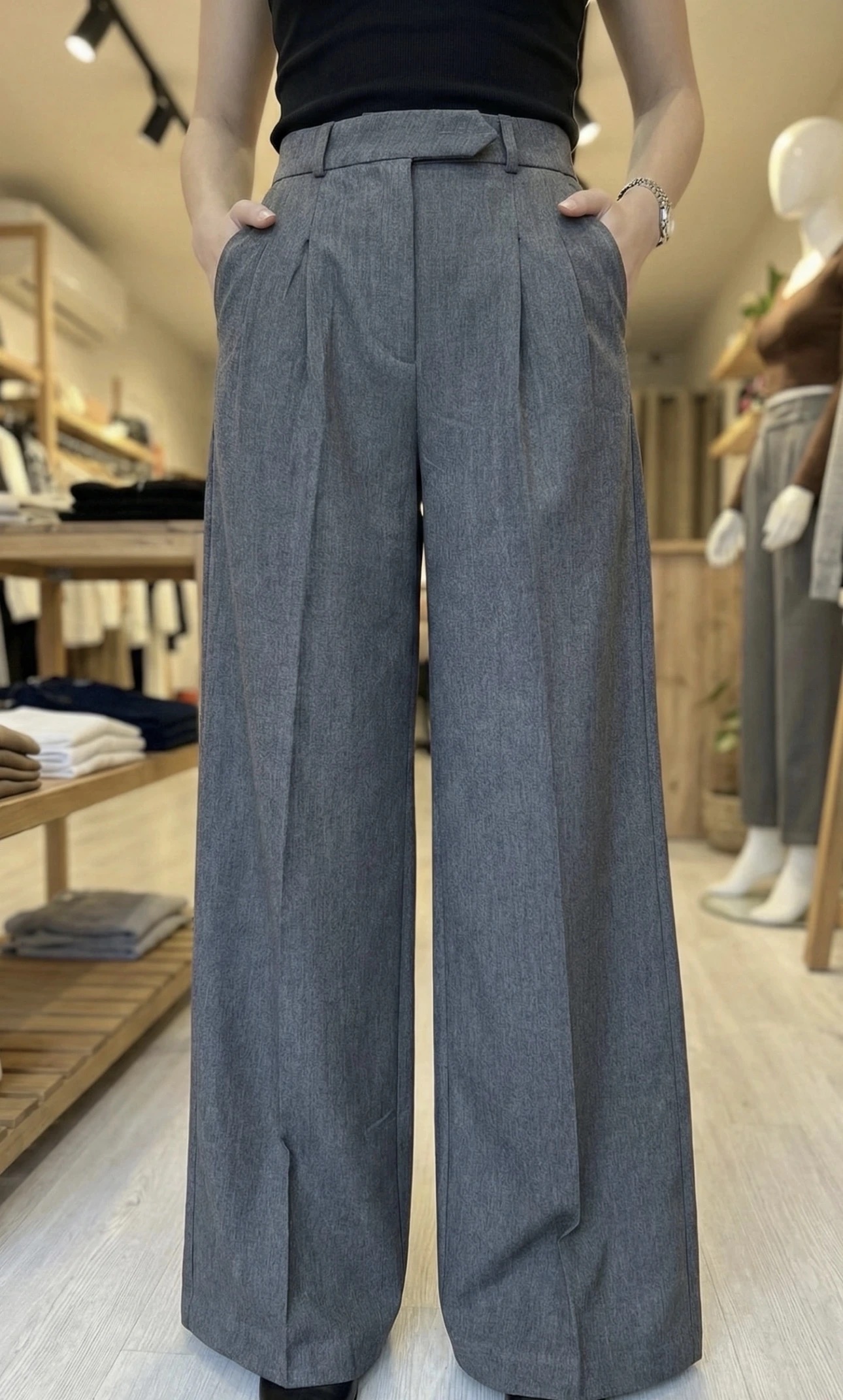 L’élégance intemporelle. Ce pantalon gris chiné à la coupe « Wide Leg » (jambe large) est un chef-d’œuvre de confort et de style. Ses pinces sur le devant et sa taille haute assurent un tombé fluide impeccable qui allonge la silhouette. C’est la base idéale pour un look de bureau chic : il se marie avec tout, du noir au blanc en passant par les couleurs vives. Une valeur sûre.