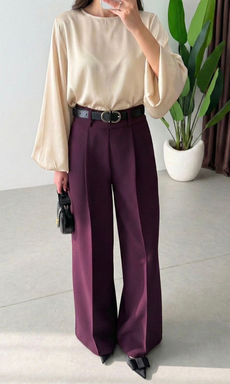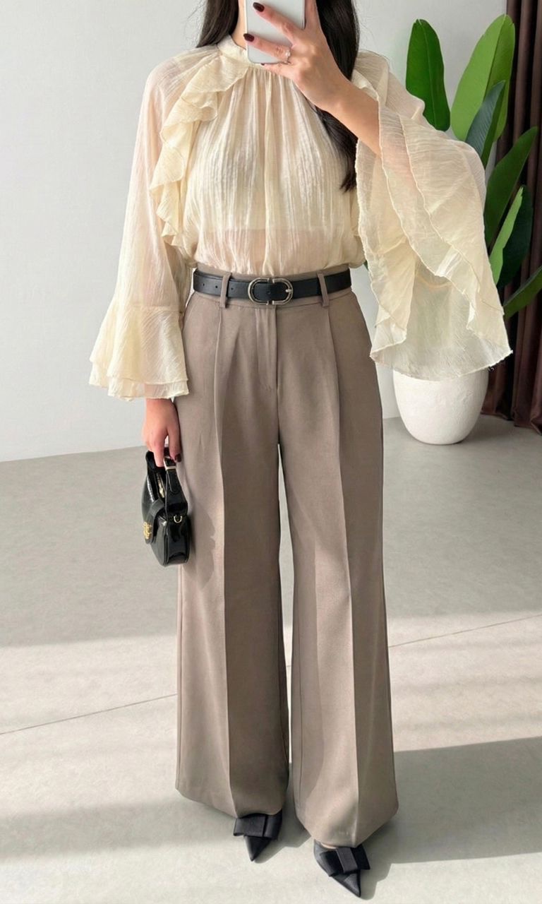 Le chic intemporel. Ce pantalon large (style Palazzo) couleur taupe / marron glacé est une merveille de coupe. Sa taille haute et ses pinces sur le devant structurent la silhouette tout en offrant un tombé fluide et gracieux. C’est l’alternative parfaite au pantalon noir classique : plus douce, plus lumineuse, mais tout aussi professionnelle. Idéal porté avec une blouse rentrée (comme sur la photo) et une ceinture fine pour marquer la taille.