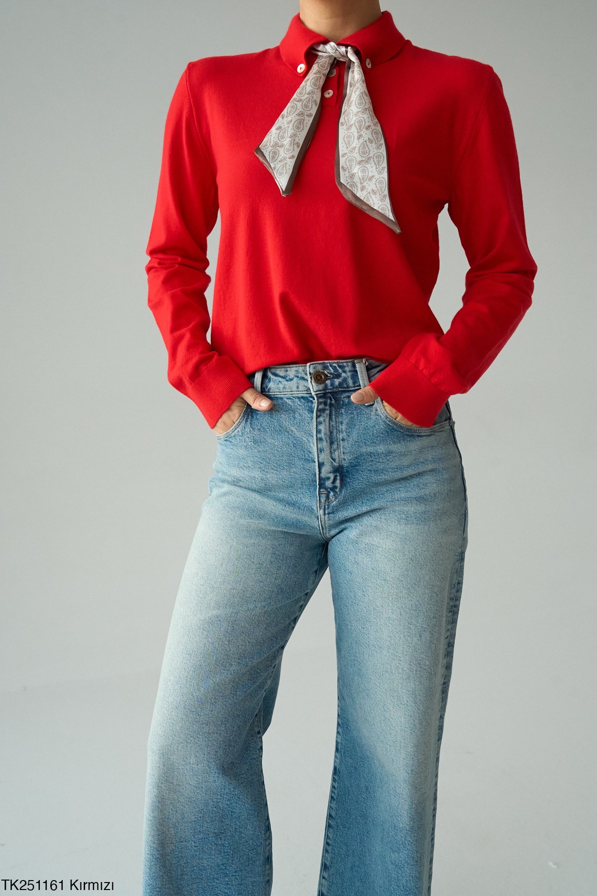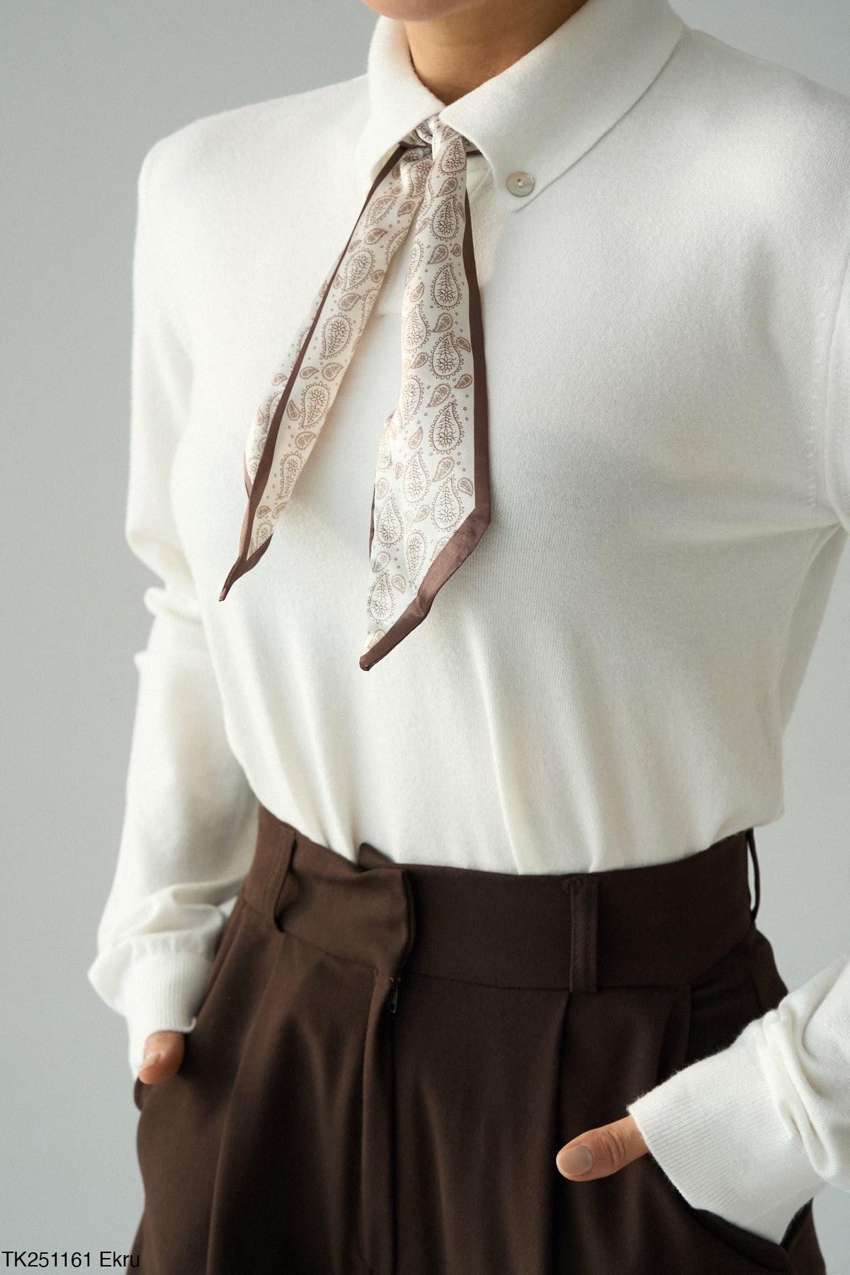 Ce pull malin intègre un col type chemise boutonné et un foulard satiné à motif cachemire (Paisley). L’illusion est parfaite : on dirait que vous portez une chemise, un foulard et un pull, mais avec le confort d’une seule pièce légère.