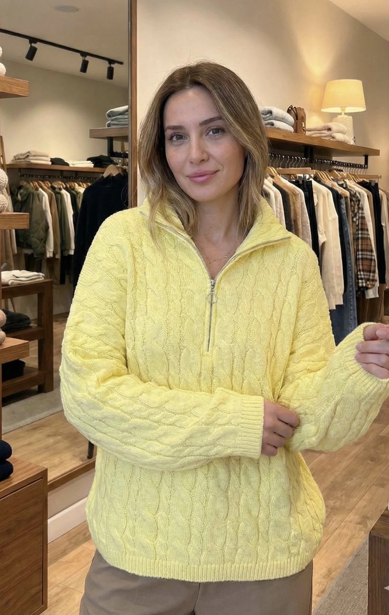 Le charme de l’ancien rencontre la modernité. Ce pull remet au goût du jour la maille torsadée classique en y ajoutant un col montant zippé (style camionneur) ultra-tendance.