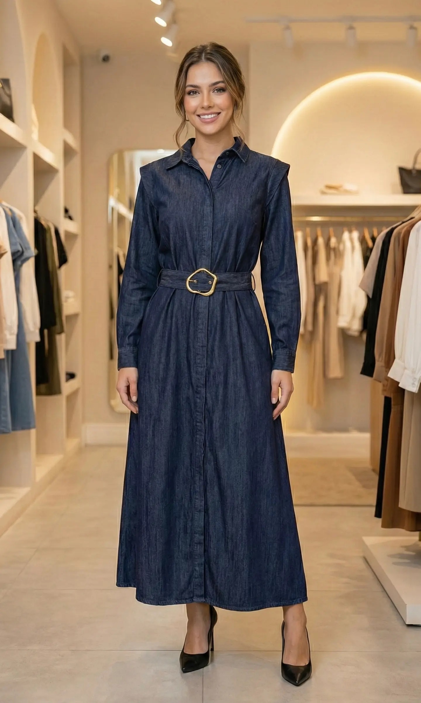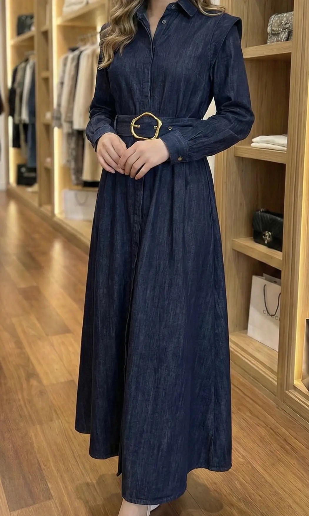 Robe Longue en Jean – Coupe Chemise & Ceinture Boucle Dorée
