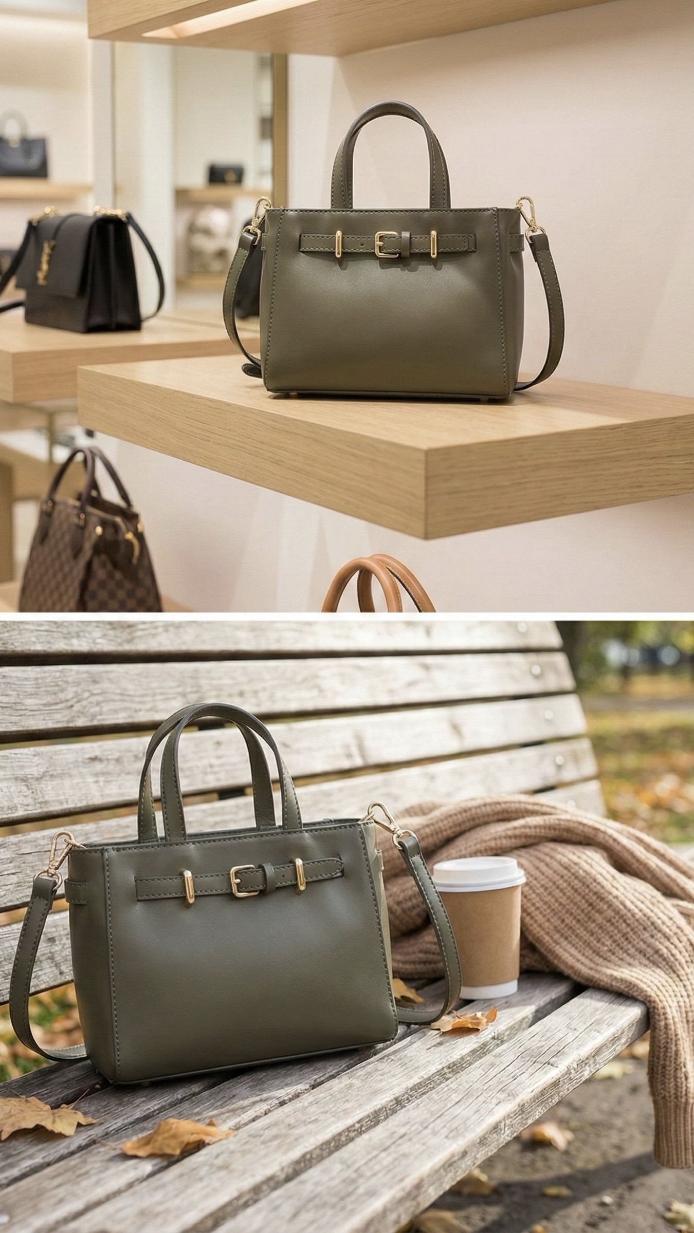 Le sac “Urban Grace” séduit par sa forme structurée et ses finitions élégantes avec détail de boucle dorée. Doté de poignées rigides et d’une bandoulière amovible, il se porte aussi bien à la main qu’en travers pour s’adapter à toutes vos journées. Disponible en vert sophistiqué ou en camel brillant, il offre un espace compact mais bien organisé pour vos essentiels. Le compagnon parfait pour un style raffiné, du bureau aux sorties.