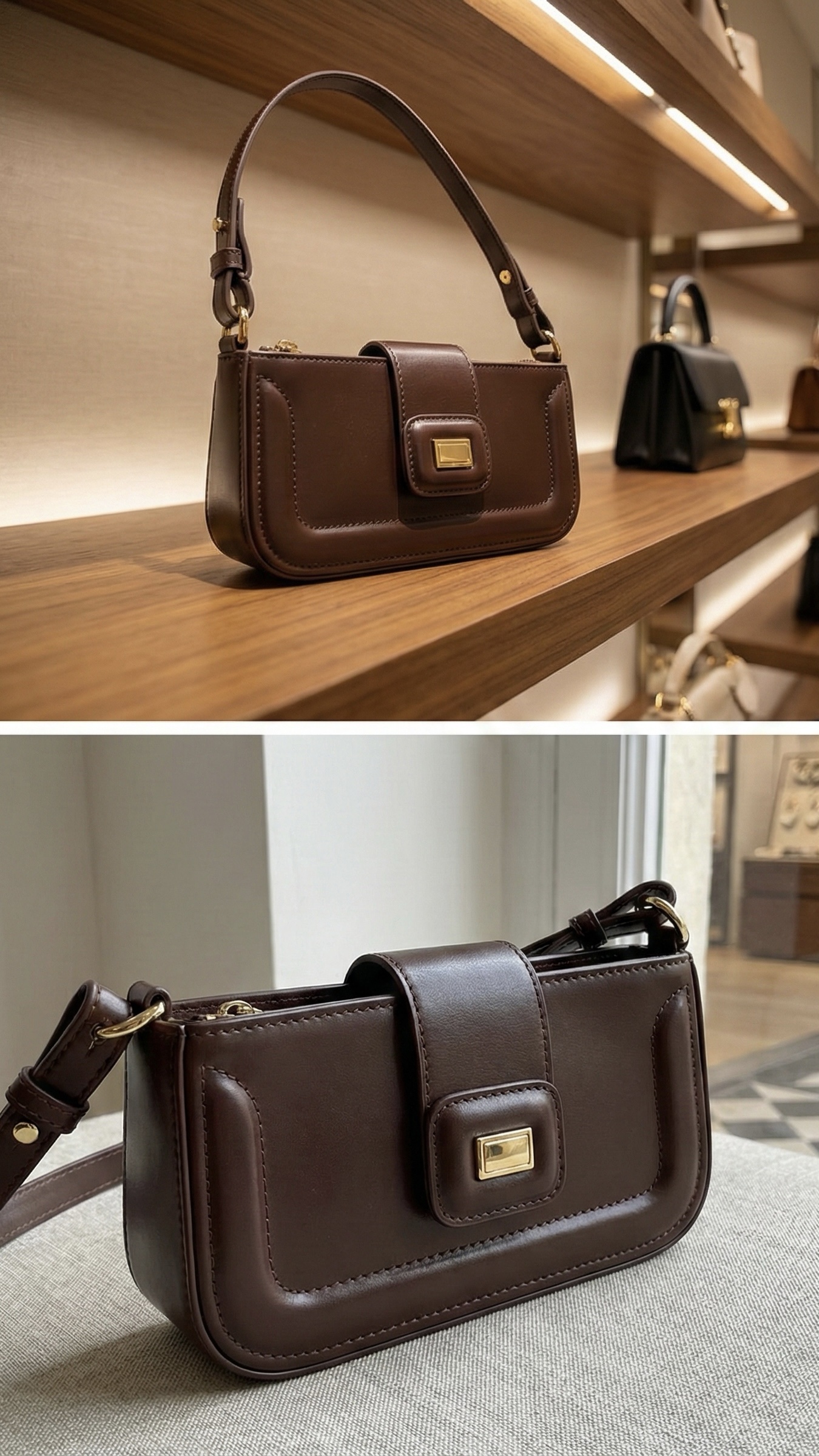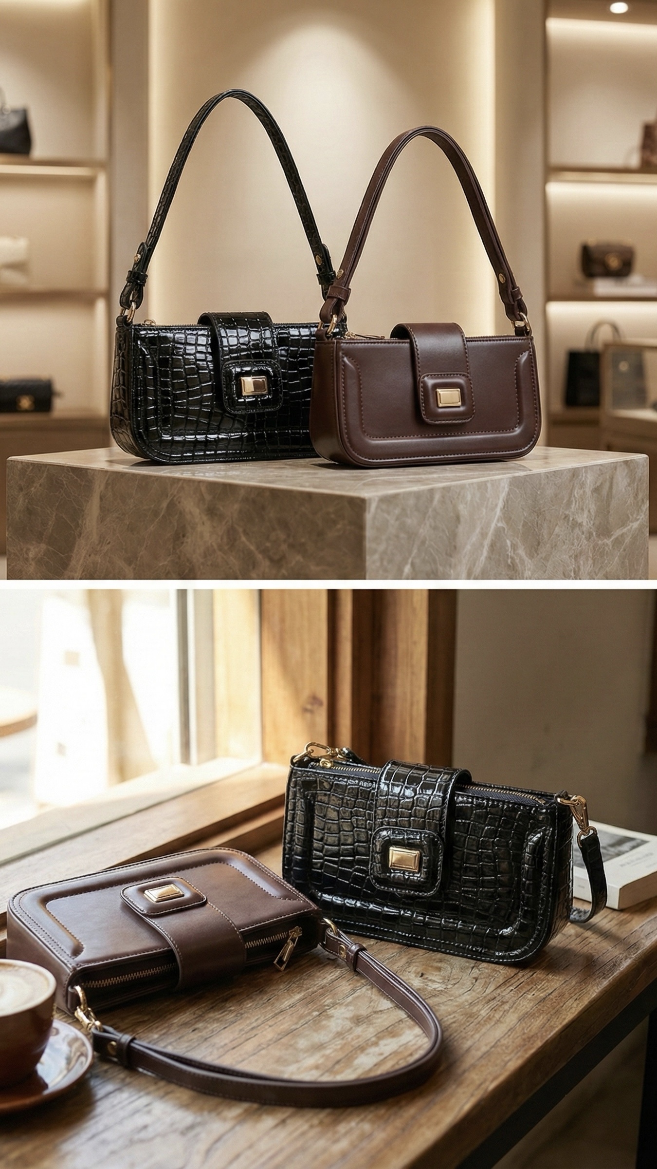 Apportez une touche chic et intemporelle à vos tenues avec ce duo de sacs baguette au design raffiné. Le modèle noir effet croco séduit par son allure sophistiquée et brillante, parfait pour les soirées et les occasions élégantes. Le modèle marron lisse, plus chaleureux et minimaliste, s’adapte idéalement aux looks du quotidien.