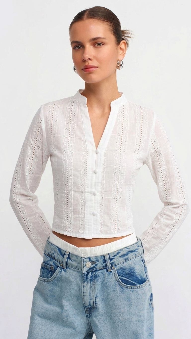 Élevez votre style avec ce top d’exception, véritable chef-d’œuvre de texture. Son motif géométrique en guipure noire sur fond blanc crée un contraste graphique saisissant et moderne. Les finitions festonnées aux poignets et à la taille soulignent le travail artisanal minutieux de la dentelle. Une pièce forte et luxueuse qui se suffit à elle-même pour structurer une silhouette sophistiquée.
