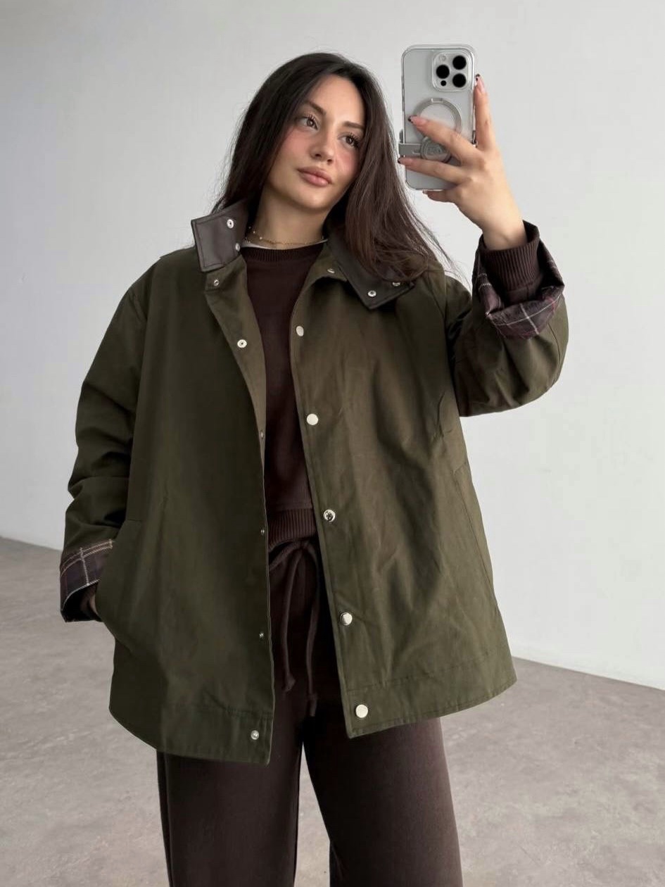 Adoptez le look « Campagne Anglaise » ultra-tendance avec cette veste courte en toile kaki.
